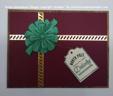I attached a piece of Gold Metallic Thread to the tag and adhered it where the ribbon strips crossed using a Glue Dot. I attached the bow covering where the ribbon strips crossed using Stampin’ Dimensionals.