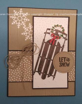 On the inside Whisper White panel I stamped the sled image from the Alpine Adventure stamp set in Crumb Cake Ink. I stamped the sentiment from the Christmas Pines stamp set in Early Espresso Ink on top of the sled. I adhered the Whisper White panel to a Crumb Cake mat using Snail, then adhered it to the Early Espresso card base using Multipurpose Liquid Glue.