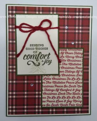 I took a smaller piece of the Festive Farmhouse DSP and adhered it to a Mossy Meadow mat using Snail. On a small piece of Very Vanilla cardstock I first stamped the tree from the Stampin’ Up Timeless Tidings stamp set in Mossy Meadow Ink, stamping off 3 times. I then stamped the sentiment from the same stamp set in Mossy Meadow Ink over the tree. I adhered it to a Mossy Meadow mat using Snail. I wrapped a piece of Cherry Cobbler cotton twine from the Festive Farmhouse Cotton Twine pack around the artwork and tied a bow. I adhered the matted DSP to the bottom right of the card front using Multipurpose Liquid Glue. I then adhered the matted artwork to the top left card front using Stampin’ Dimensionals.