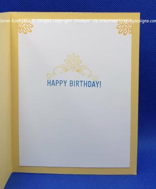 On the inside I stamped the Happy Birthday sentiment from the Amazing Life stamp set in Pacific Point Ink on a Whisper White panel. I stamped the scroll from the same stamp set above the sentiment in Mango Melody Ink, stamping off once. I stamped just the top of the same scroll in the corners in Mango Melody Ink. I adhered the Whisper White panel to the So Saffron card base using Multipurpose Liquid Glue.
