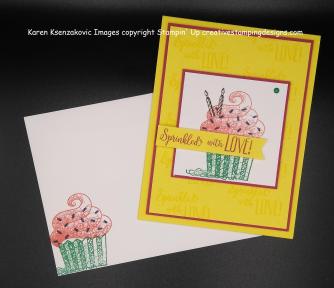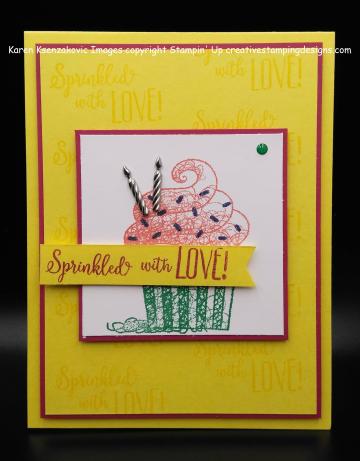 I used the Stampin’ Up Hello Cupcake stamp set. It’s one of the FREE products from Sale-A-Bration with a $50 order. I started with a Pineapple Punch card front. Using my Stamparatus I stamped the Sprinkled with Love sentiment from the Hello Cupcake in Pineapple Punch Ink. I adhered the card front to a Lovely Lipstick mat using Snail.