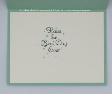For the inside I used my Tranquil Tide and Mint Macaron Stampin’ Write Markers to color just the sentiment part of one of the other images from the One For All stamp set. I stamped the sentiment in the center of a Very Vanilla panel then adhered it to the Mint Macaron card base using Multipurpose Liquid Glue.