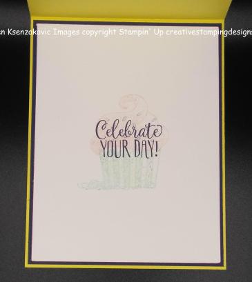 On the inside I stamped the cupcake from the Hello Cupcake stamp set the same as I did for the artwork, but I stamped off twice to get a light image on a panel of Whisper White cardstock. I stamped the sentiment from the same stamp set in Night of Navy Ink over the top of the cupcake. I adhered the Whisper White panel to a Night of Navy mat using Snail then adhered it to the Pineapple Punch card base using Multipurpose Liquid Glue.