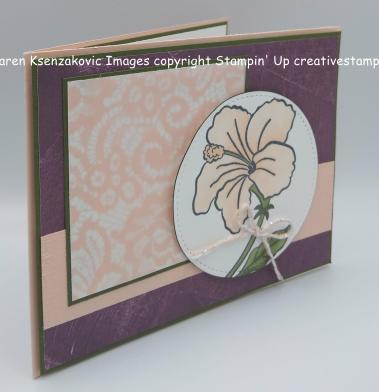 On the inside I stamped the hibiscus image from the Humming Along stamp set in Petal Pink Ink, stamping off once, to a Whisper White panel. I stamped the sentiment from the same stamp set over the hibiscus in Fresh Fig Ink. I adhered the Whisper White panel to a Mossy Meadow mat using Snail then adhered it to the Petal Pink card base using Multipurpose Liquid Glue.
