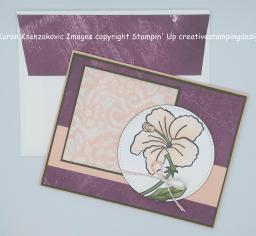 To finish my card I decorated a Medium Whisper White Envelope. I stamped the hibiscus from the Humming Along stamp set in Fresh Fig Ink on the envelope front. I colored the hibiscus in the same way I did for the card front. I adhered a piece of Tranquil Textures DSP to the envelope flap.
