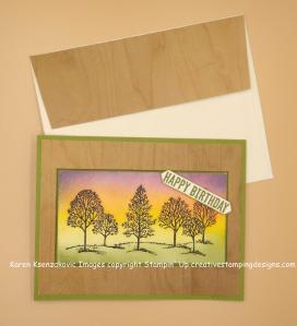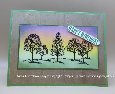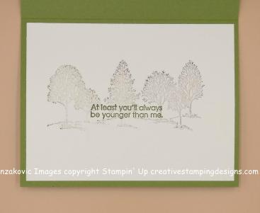 I adhered the matted artwork to the card front using Multipurpose Liquid Glue.  I stamped the Happy Birthday from the Stampin’ Up Itty Bitty Birthdays Stamp Set on a scrap of Very Vanilla cardstock in Old Olive Ink.  I punched the sentiment out using the Classic Label Punch and sponged around it with Old Olive Ink.  I adhered the sentiment to the artwork using Stampin’ Dimensionals.On the inside I stamped the tree image from Lovely As A Tree stamp set in Early Espresso Ink, stamping off 4 times, on a panel of Very Vanilla cardstock.  I stamped the sentiment from Itty Bitty Birthdays stamp set in Early Espresso Ink over the trees.  I adhered the Very Vanilla panel to the inside of the Old Olive card base using Snail.