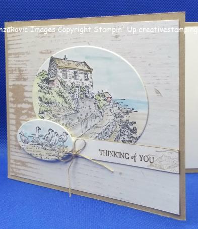 On a panel of Whisper White cardstock I stamped the house image from the Stampin’ Up By The Bay Stamp Set in Tuxedo Black Memento Ink. This beautiful stamp set is a FREE item with a $50 order during Sale-A-Bration. I just love this image and would absolutely love to be in that house looking out at the bay right now. On a smaller piece of Whisper White cardstock I stamped the seagull image in Tuxedo Black Memento Ink. Using my Aqua Painter filled with Alcohol, I water colored the images in using Balmy Blue, Cajun Craze, Crumb Cake, Gray Granite, Pacific Point, Pear Pizzazz, Sahara Sand, Smoky Slate and Soft Suede Inks. To get the ink I squeezed the stamp pad before opening it so that ink goes on the inside of the lid. I used my Aqua Painter to pick up the ink to color my picture with. When I was done with each color, I wiped the lid with paper towel to make sure ALL alcohol was off the lid before closing it. You do not want to get alcohol in your ink. Once I was done watercoloring my pictures I cut them out using the Layering Oval Framelits Dies and my Big Shot. I adhered the house and bay image to the card front using Multipurpose Liquid Glue and I adhered the seagull image using Stampin’ Dimensionals.