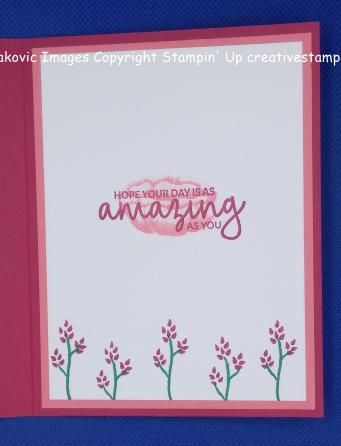 On the inside I stamped the flower stems from the Incredible Like You stamp set in Call Me Clover Ink along the bottom of a Whisper White Panel. I stamped the tiny flowers in Lovely Lipstick Ink on the stems. I stamped the larger 2-step flower the same as I did on the card front in Flirty Flamingo Ink in the center of the Whisper White panel. I stamped the sentiment from the same stamp set in Lovely Lipstick Ink over the flower. I adhered the Whisper White panel to a Flirty Flamingo mat using Snail then to the inside of the Lovely Lipstick card base using Multipurpose Liquid Glue.