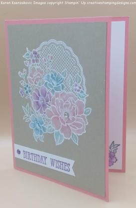 I finished my card by decorating a Medium Craft Envelope. Unfortunately these envelopes are no longer available, but it seemed to go beautifully with my card. I stamped the large flower image from the Lovely Lattice stamp set on the front of the envelope and colored it in the same as I did for the card front with my Blender Pen. I stamped the smaller flowers from the same stamp set on the envelope flap and colored them in the same as I did for the inner liner.