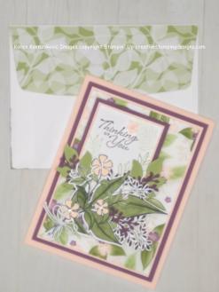 I started with a panel of Floral Romance Specialty Designer Series Paper and adhered it to a panel of Whisper White cardstock using just a few Glue dots where you wouldn’t see them to easily since it was the Vellum. I then adhered it to a Petal Pink mat using Multipurpose Liquid Glue and then to a Fresh Fig mat using Multipurpose Liquid Glue. I adhered the double matted DSP to a Petal Pink card base using Stampin’ Dimensionals.