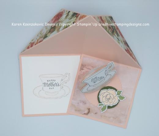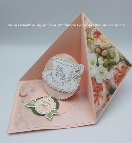 I took a 3″ X 6″ piece of Petal Pink cardstock and folded it in half. Using the 3rd largest scalloped circle from the Layering Circle Framelits Dies, I cut it out not putting the full circle on my paper, letting it hang over the folded edge about 1/4″ so that it would open up like a card. I folded the top of the scallop circle up and in half meeting the little scallops to make the easel. I cut another of the same size scallop circle from a piece of the Petal Promenade DSP and adhered it to the top section of the scallop circle. Using the 2nd smallest scallop circle from the Layering Circle Framelits Dies I cut a piece of Mossy Meadow cardstock to make the easel stopper. On a panel of Whisper White cardstock I stamped the teacup image, the sentiment in the teacup and the large rose image from the Stampin’ Up Tea Together Stamp Set in Smoky Slate Ink. I colored them in using the Petal Pink and Light Mossy Meadow Stampin’ Blends Markers. I cut the images using the Tea Time Framelits Dies and my Big Shot. I adhered the teacup to the scalloped circle using Stampin’ Dimensionals. I adhered the rose to the small Mossy Meadow scalloped circle using Multipurpose Liquid Glue. I adhered the Mossy Meadow scalloped circle to the Petal Pink scalloped circle using Stampin’ Dimensionals placing it where I wanted the easel to stand open. I adhered the easel piece to the center of the card base using Multipurpose Liquid Glue.