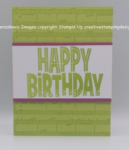 I started with a Lemon Lime Twist card base and stamped the front using the Stampin’ Up Sheet Music Stamp in Lemon Lime Twist Ink.