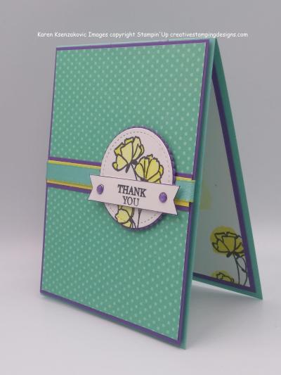 • Gorgeous Grape Cardstock 4 1/8″ X 5 3/8″ (card front mat), 5/8″ X 4″ (strip on card front), 2 1/2″ X 2 1/2″ (scalloped circle), 4″ X 5 1/4″ (inner liner mat)