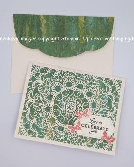 To finish my card I decorated one of the envelopes that comes with the Bird Ballad Laser Cut Cards & Tin. I stamped the flower and butterfly images from the Butterfly Wishes stamp set in Terracotta Tile Ink on the front of the envelope. I adhered a piece of Perennial Essence DSP to the envelope flap. Isn’t the scalloped edge of the envelope beautiful?