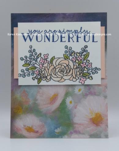 I stamped one of the floral images from the Bloom & Grow stamp set in Tuxedo Black Memento Ink on a panel of Whisper White cardstock.  I colored the image in using my Balmy Blue, Flirty Flamingo, Old Olive, Petal Pink and So Saffron Stampin’ Blends Markers.  I stamped the sentiment from the Bloom & Grow stamp set in Blueberry Bushel Ink above the floral image.