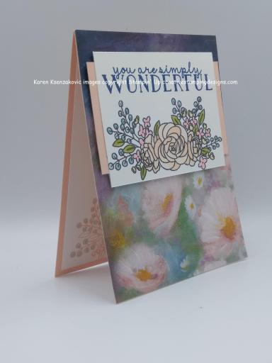 I started by adhering a panel of the beautiful Perennial Essence Designer Series Paper to a Petal Pink card base using Multipurpose Liquid Glue.
