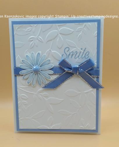 For today I have a Clean and Simple, Quick and Easy card for you. This is one of the very few times that I only used one color, not counting white. I’m trying out some ideas do use for my next class that I’d like to feature the Stampin’ Up Daisy Lane Bundle. Here’s my card.