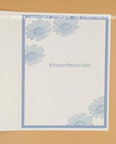 On the inside I stamped another one of the daisy images from the Daisy Lane stamp set in Seaside Spray Ink on the top and bottom corner of a Whisper White panel. I stamped the sentiment from the Daisy Lane stamp set in the center of the Whisper White panel. I adhered the Whisper White panel to a Seaside Spray mat using Snail and then to the inside of the Thick Whisper White card base using Multipurpose Liquid Glue.