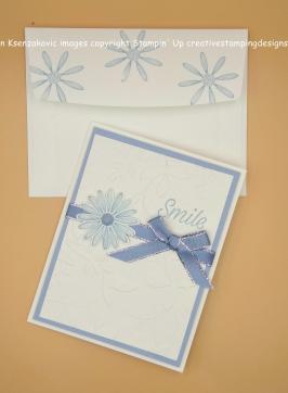 To finish my card I stamped the smaller daisy image from the Daisy Lane stamp set in Seaside Spray Ink on the envelope front. I stamped the medium daisy from the Daisy Lane stamp set on the envelope flap.