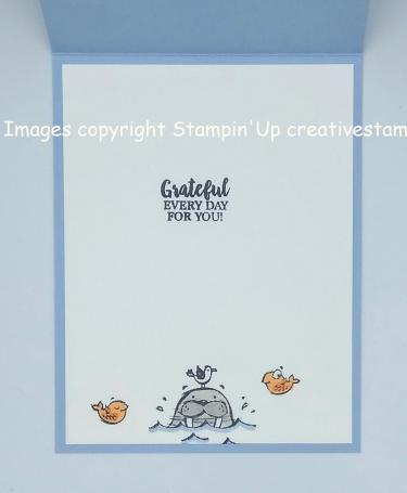 On the inside I stamped another one of the walrus images and the 2 fish images from the We’ll Walrus Be Friends stamp set in Tuxedo Black Memento Ink on the bottom of a Whisper White panel. I colored the image in using my Gray Granite, Pumpkin Pie and Seaside Spray Stampin’ Blends Markers. I stamped the sentiment from the Stampin’ Up A Big Thank You Photopolymer Stamp Set in the center of the Whisper White panel in Tuxedo Black Memento Ink. I adhered the Whisper White panel to the inside of the Seaside Spray card base using Multipurpose Liquid Glue.