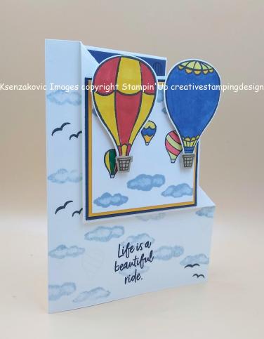 After flipping the cut piece, I adhered a panel of Night of Navy of Navy and Mango Melody to the turned panel. On a panel of Whisper White cardstock I stamped the cluster of clouds from the Stampin’ Up Above The Clouds Photopolymer Stamp Set in Seaside Spray Ink. I then stamped the cluster of hot air balloons from the Above The Clouds stamp set in Tuxedo Black Ink. On a small panel of Whisper White cardstock I stamped the 2 large hot air balloons from the Above The Clouds stamp set in Tuxedo Black Memento Ink and punched them out using the Hot Air Balloon Punch. I colored all the balloons in using my Call Me Clover, Crumb Cake, Daffodil Delight, Mango Melody, Night of Navy, Poppy Parade and Pumpkin Pie Stampin’ Blends Markers. I adhered the artwork panel to the card front using Snail. I adhered the 2 larger hot air balloons to the card front using Stampin’ Dimensionals. On a scrap piece of Crumb Cake cardstock I stamped the balloon basket from the Above The Clouds stamp set in Soft Suede Ink twice and punched them out using the Hot Air Balloon Punch. I adhered them using a Mini Stampin’ Dimensional to the bottom of the larger balloons.