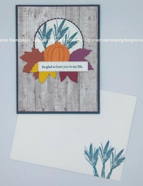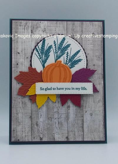 On a small panel of Whisper White cardstock I stamped the wheat image from the Stampin’ Up Gather Together Photopolymer Stamp Set (available Sept 4) in Pretty Peacock Ink 3 times. I cut the image out using the 2nd largest circle from the Stitched Shapes Dies. I adhered it to a Blackberry Bliss scallop circle mat, which I had cut out using my Layering Circles Dies, using Snail and then adhered it to the card front using Stampin’ Dimensionals. Using the Gathered Leaves Dies (available Sept 4) I cut out 4 leaves, 1 each in Cajun Craze, Crushed Curry, Cherry Cobbler and Rich Razzleberry cardstock. I stamped the single pumpkin image from the Gather Together stamp set on a piece of Pumpkin Pie cardstock in Pumpkin Pie Ink and cut it out using the Gathered Leaves Dies. I arranged the leaves and pumpkin on the bottom of the stitched circle the way I liked them and adhered them using Glue Dots and Stampin’ Dimensionals.