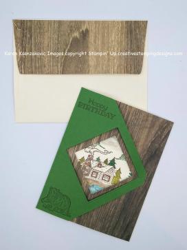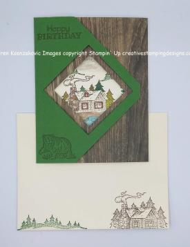 This is where I had fun doing all the artwork that took me multiple tries because of my OCD. I stamped the cabin image from the Rustic Retreat stamp set in Soft Suede Ink in the center of a Very Vanilla panel. I colored the cabin in using my Cajun Craze, Crumb Cake, Gray Granite, Old Olive and Shaded Spruce Stampin’ Blends Markers. I stamped the mountain images from the Waterfront stamp set behind the cabin in Gray Granite and Smoky Slate Inks stamping off once. I stamped the small trees from the Rustic Retreat stamp set in Garden Green Ink in front of the mountains. I stamped the water image from the Waterfront stamp set in Balmy Blue Ink below the cabin. I stamped the sand image from the Waterfront stamp set between the water and cabin in Crumb Cake Ink. I stamped the taller trees from the Waterfront stamp set on either side of the cabin in Shaded Spruce Ink. I stamped the sentiment from the Stampin’ Up Itty Bitty Birthday’s Cling Stamp Set in Soft Suede Ink below the artwork. I adhered the Very Vanilla panel to a Garden Green mat using Snail and then to the inside of the Thick Very Vanilla card base using Multipurpose Liquid Glue.