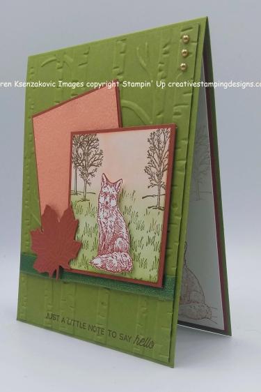 Using my Layering Squares Dies I placed the die so that there was equal space from both edges to the die on my Garden Green panel and ran it through my die cutting machine. I stamped the sentiment from the Stampin’ Up Rustic Retreat Cling Stamp Set on the top of the Garden Green panel in Soft Suede Ink. I stamped the bear image from the Rustic Retreat stamp set in Soft Suede Ink on the bottom of the Garden Green panel.