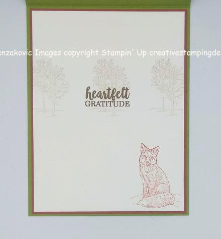 This is where I had fun doing all the artwork that took me multiple tries because of my OCD. I stamped the cabin image from the Rustic Retreat stamp set in Soft Suede Ink in the center of a Very Vanilla panel. I colored the cabin in using my Cajun Craze, Crumb Cake, Gray Granite, Old Olive and Shaded Spruce Stampin’ Blends Markers. I stamped the mountain images from the Waterfront stamp set behind the cabin in Gray Granite and Smoky Slate Inks stamping off once. I stamped the small trees from the Rustic Retreat stamp set in Garden Green Ink in front of the mountains. I stamped the water image from the Waterfront stamp set in Balmy Blue Ink below the cabin. I stamped the sand image from the Waterfront stamp set between the water and cabin in Crumb Cake Ink. I stamped the taller trees from the Waterfront stamp set on either side of the cabin in Shaded Spruce Ink. I stamped the sentiment from the Stampin’ Up Itty Bitty Birthday’s Cling Stamp Set in Soft Suede Ink below the artwork. I adhered the Very Vanilla panel to a Garden Green mat using Snail and then to the inside of the Thick Very Vanilla card base using Multipurpose Liquid Glue.