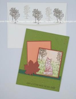 To finish my card I decorated a Medium Very Vanilla Envelope. I stamped the cabin image from the Rustic Retreat stamp set in Soft Suede Ink on the envelope front. I stamped the tree image from the Rustic Retreat stamp set in Garden Green Ink on the envelope front also. I adhered a panel of the Pressed Petals Specialty DSP to the envelope flap.
