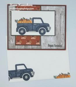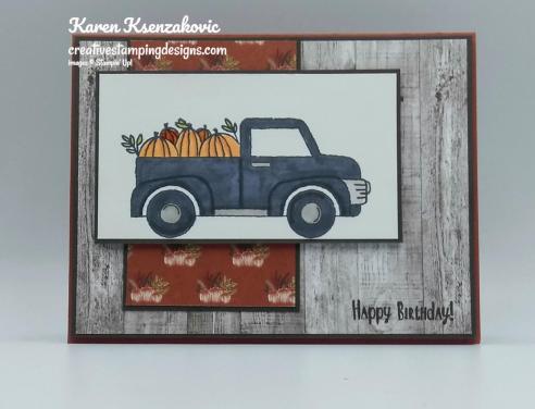 On a panel of Whisper White cardstock I stamped the truck image from the Ride With Me stamp set in Tuxedo Black Memento Ink.  I stamped the pumpkin image from the Ride With Me stamp set in the back of the truck in Tuxedo Black Memento Ink.  I colored the images in using my Basic black, Gray Granite, Old Olive and Pumpkin Pie Stampin’ Blends Markers.  I adhered the artwork to an Early Espresso mat using Snail.  I adhered the matted artwork to the card front using Stampin’ Dimensionals.