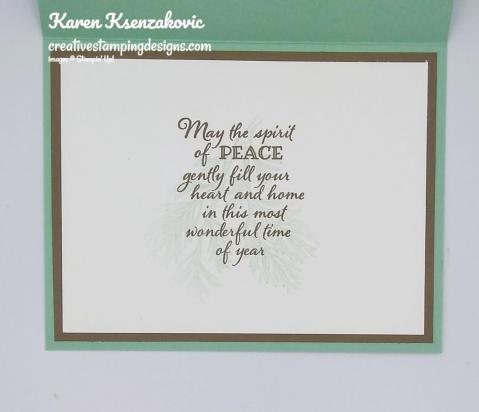 On the inside I stamped the sentiment from the Peaceful Boughs stamp set in Soft Suede Ink in the center of a Whisper White panel.  I stamped the pine bough image from the Peaceful Boughs stamp set in Mint Macaron Ink over the sentiment stamping off once.  I adhered the Whisper White panel to a Soft Suede mat using Snail and then to the inside of the Mint Macaron card base using Multipurpose Liquid Glue.