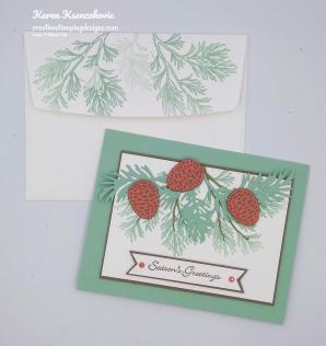To finish my card I decorated a Medium Whisper White Envelope.  I stamped the pine bough image from the Peaceful Boughs stamp set in Mint Macaron Ink on the envelope front and envelope flap, some in full strength ink and some stamped off once.