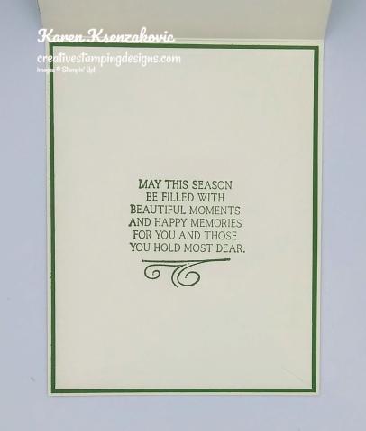 On the inside I stamped the sentiment from the Stampin’ Up! Toile Christmas Cling Stamp Set in the center of a Very Vanilla panel in Garden Green Ink. I stamped the scroll image from the Toile Christmas stamp set in Garden Green Ink below the sentiment. I adhered the Very Vanilla panel to a Garden Green mat using Snail and then to the inside of the Thick Very Vanilla card base using Multipurpose Liquid Glue.