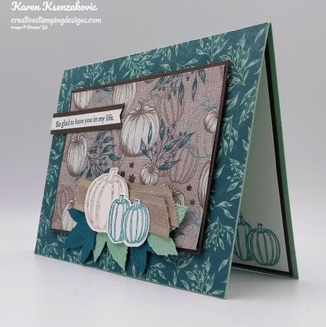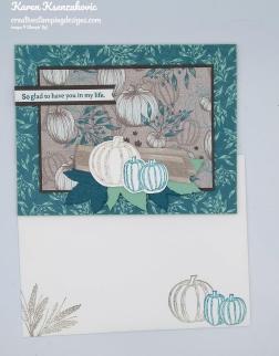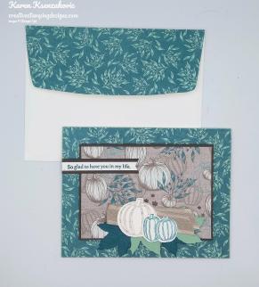 To finish my card I decorated a Medium Whisper White Envelope. I stamped the smaller pumpkin image from the Gather Together stamp set in Pretty Peacock Ink on the envelope front stamping off once. I masked the image and stamped the larger pumpkin image from the Gather Together stamp set in Early Espresso Ink over the smaller image, stamping off 3 times. I stamped the wheat image from the Gather Together stamp set in Early Espresso Ink stamping off 3 times, twice on the bottom of the envelope front. I adhered a panel of the Come To Gather DSP to the envelope flap.