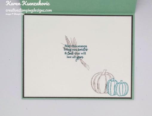 On the inside I stamped the sentiment from the Gather Together stamp set in Pretty Peacock Ink in the center of a Whisper White panel. I stamped the wheat image from the Gather Together stamp set in Early Espresso Ink over the sentiment stamping off 3 times. I stamped the smaller pumpkin image from the Gather Together stamp set in Pretty Peacock Ink on the bottom of the Whisper White panel. I masked the image and stamped the larger pumpkin image from the Gather Together stamp set in Early Espresso Ink, stamping off 3 times, over the smaller pumpkin image. I adhered the Whisper White panel to an Early Espresso mat using Snail and adhered it to the inside of the Mint Macaron card base using Multipurpose Liquid Glue.