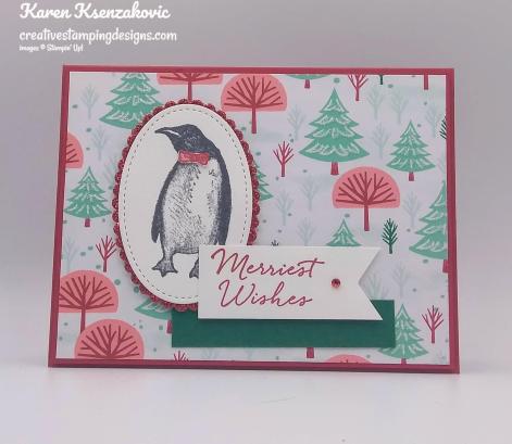 I stamped the sentiment from the Playful Penguins stamp set in Real Red Ink on a strip of Whisper White cardstock. I cut the strip into a banner using the Banner Triple Punch. I adhered a strip of Shaded Spruce cardstock below the matted artwork using Snail and adhered the sentiment banner on the card front using Stampin’ Dimensionals. I added a Red Rhinestone Basic Jewel to the right of the sentiment.