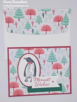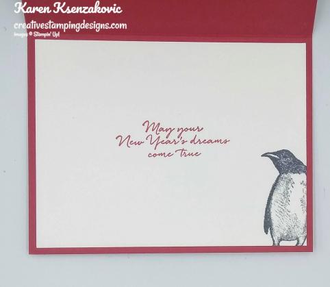 On the inside I stamped the sentiment from the Playful Penguins stamp set in Real Red Ink in the center of a Whisper White panel. I stamped the penguin image from the Playful Penguins stamp set in Tuxedo Black Memento Ink on the bottom of the panel. I adhered the Whisper White panel to the inside of the Real Red card base using Multipurpose Liquid Glue.