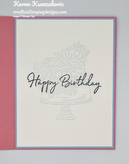 On the inside I stamped the sentiment from the Happy Birthday To You stamp set in Tuxedo Black Memento Ink. I stamped the cake image from the Happy Birthday To You stamp set in Seaside Spray Ink, stamping off once, to the center of the Whisper White panel over the sentiment. I adhered the Whisper White panel to a Seaside Spray mat using Snail and then to the inside of the Rococo Rose card base using Multipurpose Liquid Glue.
