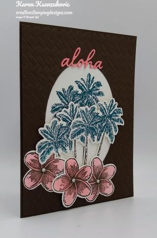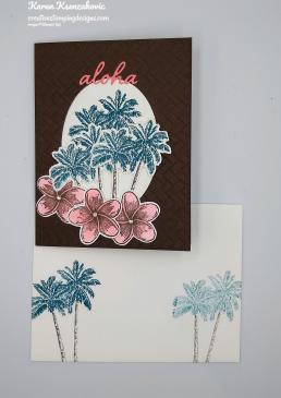 On a Whisper White panel I stamped the palm tree image from the Stampin’ Up! Timeless Tropical Cling Stamp Set using my Early Espresso and Pretty Peacock Stampin’ Write Markers. I stamped 2 more palm trees on a smaller panel of Whisper White cardstock using my Early Espresso and Pretty Peacock Stampin’ Write Markers. I cut the 2 additional palm trees out using my In The Tropics Dies. I adhered the Whisper White panel to the back of the embossed Early Espresso card front using Multipurpose Liquid Glue. I adhered the palm trees to the artwork using Stampin’ Dimensionals.