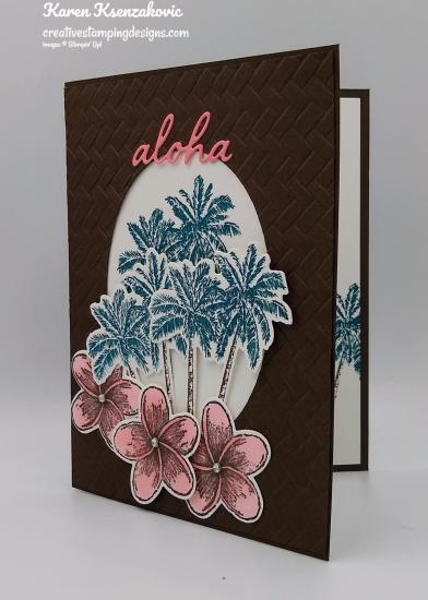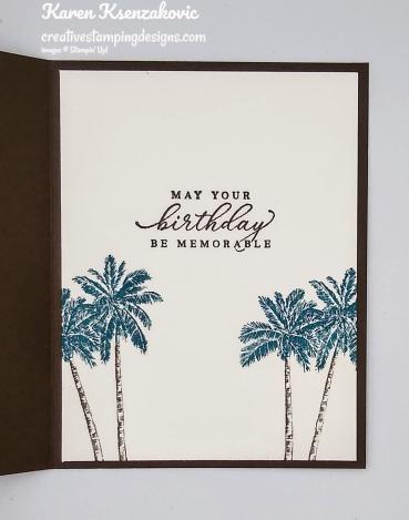 On the inside I stamped the sentiment from the Timeless Tropical stamp set in Early Espresso Ink in the center of a Whisper White panel. I stamped the palm tree image from the Timeless Tropical stamp set twice on the bottom of the panel using my Early Espresso and Pretty Peacock Stampin’ Write Markers. I adhered the Whisper White panel to the inside of the Early Espresso card base using Multipurpose Liquid Glue.