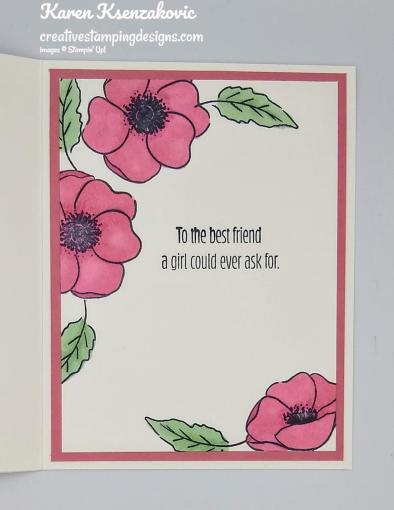 On the inside I stamped the sentiment from the Meant To Be stamp set in the center of a Whisper White panel in Tuxedo Black Memento Ink.  I stamped the poppy and leaf images from the Painted Poppies stamp set in Tuxedo Black Memento Ink on the top and bottom corners of the Whisper White panel.  I colored the images in using my Mint Macaron and Rococo Rose Stampin’ Blends Markers.  I adhered the Whisper White panel to a Rococo Rose mat using Snail and then to the inside of the Whisper White card base using Multipurpose Liquid Glue.