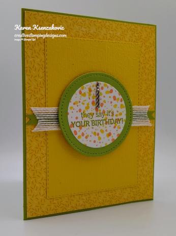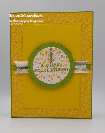 I cut a panel of Daffodil Delight cardstock using the Rectangle Stitched Dies and then embossed it using my Subtle 3D Embossing Folder.  I adhered the rectangle to the card front using Multipurpose Liquid Glue.  I cut a thin strip of Pear Pizzazz cardstock into a banner using my Paper Snips and adhered it across the rectangle using Multipurpose Liquid Glue.  I made banner ends on a piece of 5/8″ Whisper White Flax Ribbon and adhered it over the Pear Pizzazz using Snail.  I adhered the sentiment circle on top of the ribbon using Stampin’ Dimensionals.  I added a Candle Embellishment above the sentiment.