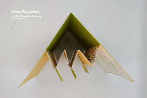 The inside is where the fun fold comes in.  I took a 5 3/8″ X 10 1/2″ piece of the Birthday Bonanza DSP and scored it at 2 1/4″, 3 1/4″, 4 1/4″, 5 1/4″, 6 1/4″, 7 1/4″ & 8 1/4″ and folded it like an accordion.  It should look like the picture above.