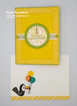 I stamped the sentiment from the Stampin’ Up! Itty Bitty Birthdays Cling Stamp Set on a panel of Whisper White cardstock in Pear Pizzazz Ink.  I stamped the splatter image from the Stampin’ Up! Delightful Day Photopolymer Stamp Set in Daffodil Delight and Grapefruit Grove Inks all around and over the sentiment.  I cut the sentiment out using my Layering Circles Dies.  I cut a circle out of Pear Pizzazz cardstock using the Stitched Shapes Dies.  I adhered the sentiment circle to the Pear Pizzazz circle using Snail.