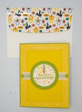 To finish my card I decorated a Medium Whisper White Envelope.  I adhered a strip of Birthday Bonanza DSP to the card front using Multipurpose Liquid Glue.  I fussy cut another one of the images from the Birthday Bonanza DSP and adhered it to the card front using Multipurpose Liquid Glue.  I adhered a panel of the Birthday Bonanza DSP to the envelope flap.