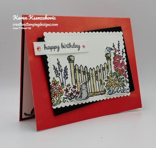 On a panel of Whisper White cardstock I stamped the fence image and flower image from the Stampin’ Up! Grace’s Garden Photopolymer Stamp Set in Tuxedo Black Memento Ink. I colored the images in using my Calypso Coral, Crumb Cake, Old Olive, Poppy Parade and Rich Razzleberry Stampin’ Blends Markers. I cut the panel using the largest scalloped rectangle from the Stitched So Sweetly Dies. On a scrap piece of Whisper White cardstock I stamped the flower images, cat and bird images from the Grace’s Garden stamp set in Tuxedo Black Memento Ink. I colored the images in using my Balmy Blue, Old Olive, Poppy Parade, Smoky Slate and So Saffron Stampin’ Blends Markers. I cut the images out using my Garden Gateway Dies. I adhered the die cut images to my artwork using Glue Dots and Stampin’ Dimensionals.