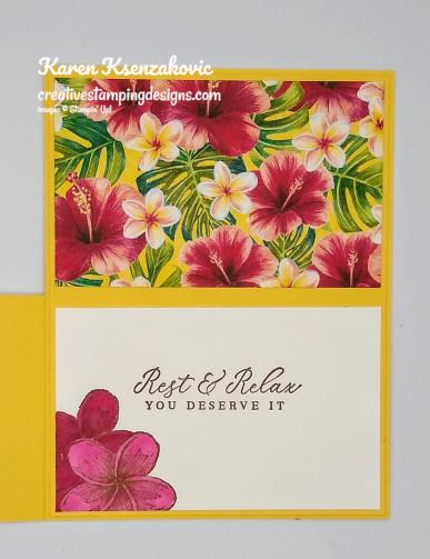 On the inside I stamped the sentiment from the Timeless Tropical stamp set in Soft Suede Ink in the center of the Whisper White panel.  I stamped the small flower image from the Timeless Tropical stamp set in Soft Suede Ink on the bottom corner of the panel.  I colored the flowers in using my Lovely Lipstick Stampin’ Blends Markers.  I adhered the Whisper White panel to the bottom of a So Saffron panel using Snail.   I adhered a panel of the Tropical Oasis DSP to the top of the So Saffron panel using Snail.  I adhered the panel to the inside of the card base using Multipurpose Liquid Glue.
