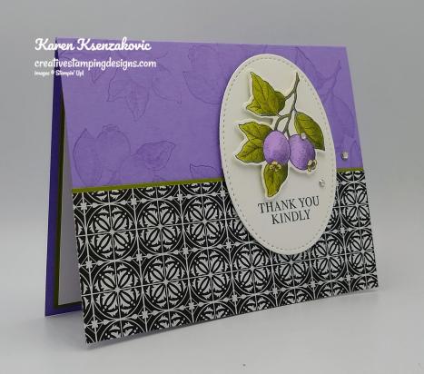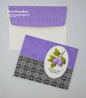 To finish my card I stamped the leaf/berry image from the Botanical Prints stamp set in Tuxedo Black Memento Ink on the bottom front of the envelope. I colored the image in using my Highland Heather, Old Olive and So Saffron Stampin’ Blends Markers. I adhered a panel of the Highland Heather Subtle 6 X 6 Designer Series Paper to the envelope flap.