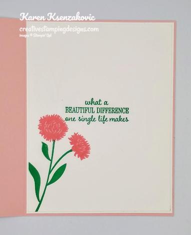 On the inside I stamped the sentiment from the Timeless Tulips stamp set in Call Me Clover Ink in the center of a Whisper White panel.  I stamped the stem image from the Field of Flowers stamp set in Call Me Clover Ink on the bottom of the panel.  I stamped the flower image from the Field of Flowers stamp set in Flirty Flamingo Ink on top of the stems.  I adhered the Whisper White panel to a Whisper White mat using Snail and then to the inside of the Blushing Bride card base using Multipurpose Liquid Glue.